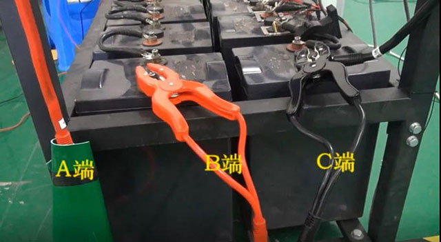 將系統正極線纜拆下,使用萬用表驗證組端正負極,將放電導線另一端分別與電池組兩端及系統正極連接【按照“系統+”一紅線接入系統正極(A端)、“電池+”一紅線為電池組端正極(B端)、“電池-”一黑線接入電池負極(C端)連接到系統正極線纜與電池組正負極