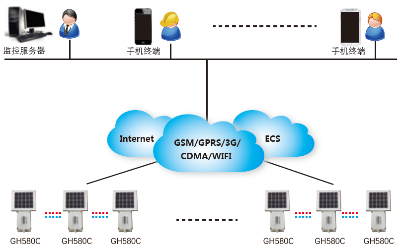GH580C系統硬件部分由監控服務器和若干監測子站組成。其中監測子站又由監測子站主機、太陽能電池板組成。監控服務器機可為各省公司配備的服務器,也可為用戶自行配備的普通計算機。