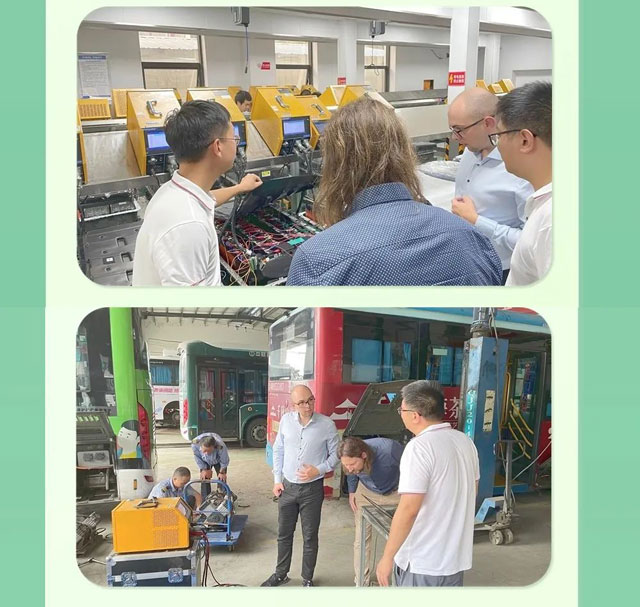 在新能源大巴車維護現場的參觀中,PA電子團隊向德國客戶介紹了多種不同的新能源電池測試維護設備,對PA電子的功能特性以及操作方法一一詳細解答,并通過現場的實際操作演示,讓客戶更深入地了解了PA電子的細節與特點。德國客戶對PA電子的優質PA電子、前沿的研發技術、嚴格的質量控制和先進的模式留下了深刻印象。